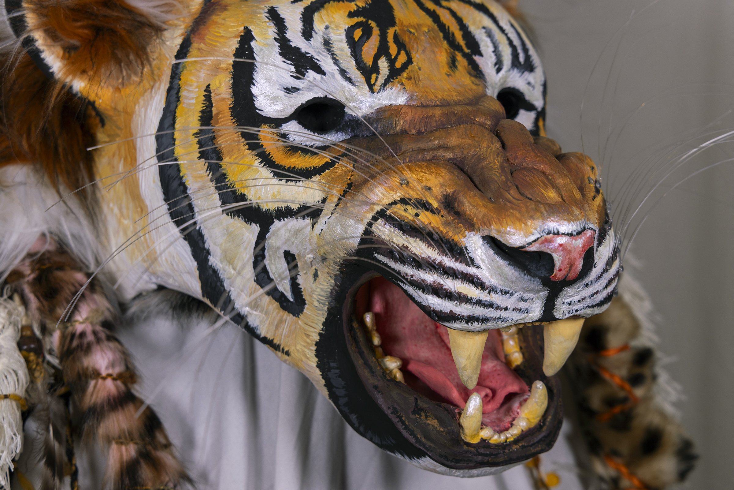 Aluminum foil, cardboard, papier-mâché, Creative Paperclay, acrylic paint, fishing wire, natural and artificial fibers, bird feathers, buffalo bone, and fox claws.